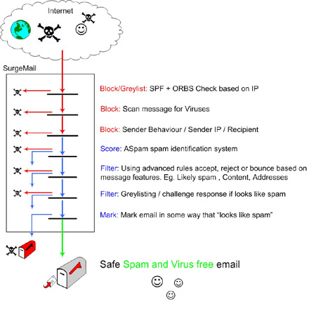 SurgeMail offers advanced features to identify undesirable spam email, block virus infected mail and prevent abuse of your mail server by spammers. Incoming mail is scrutinised as shown in the diagram.